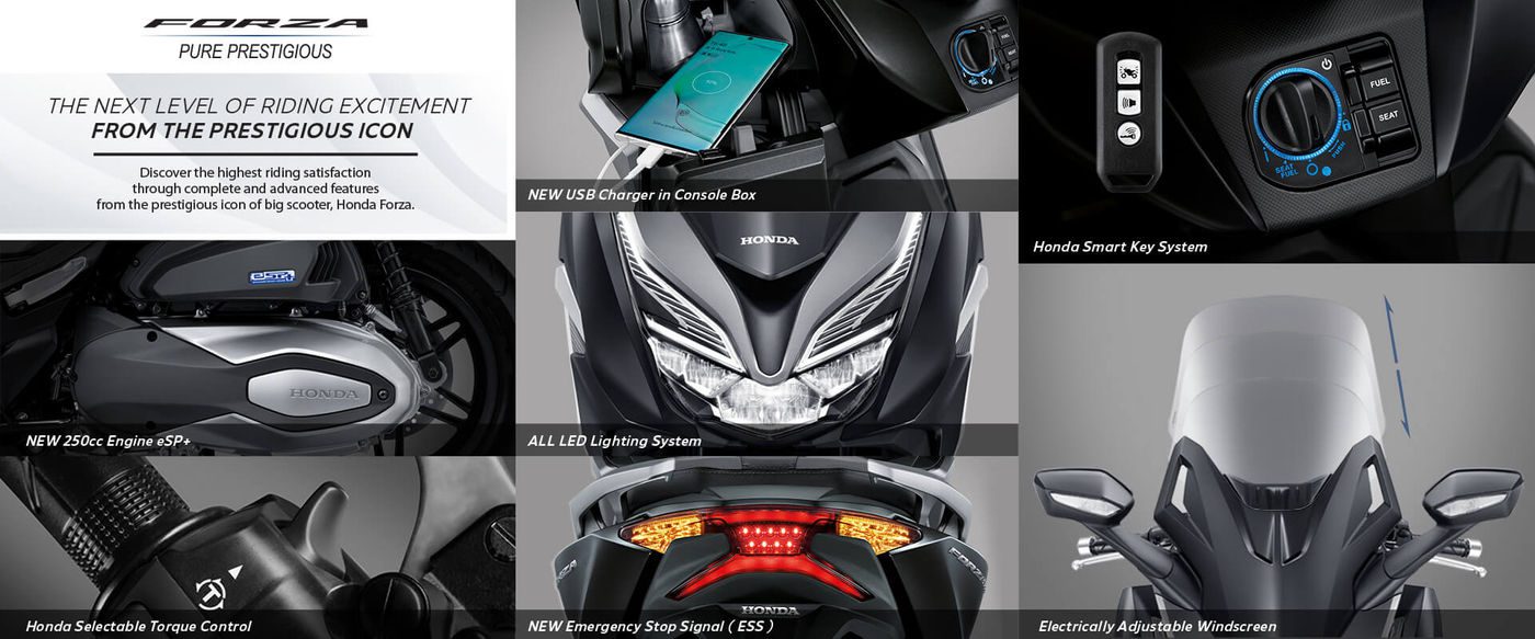 Honda Forza 250 merupakan skutik bertenaga yang tersedia dalam 4 pilihan warna dan satu varian di Indonesia. Mobil ini ditenagai oleh mesin 249 cc dengan transmisi Variable-Speed, dan memiliki tempat duduk yang ditinggikan 780 mm dari tanah, dengan berat total 182 kg. Remnya dilengkapi dengan Cakram di roda depan dan belakang. Lebih dari 4 pengguna telah memberikan peringkat mereka untuk Forza 250 berdasarkan fitur, jangkauan, kenyamanan tempat duduk, dan performa mesin.